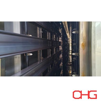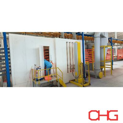 Τα τεμάχια που επικαλύπτονται από αυτήν την αυτόματη γραμμή βαφής πούδρας είναι ράφια και το μήκος των κρεμαστρών είναι 13,5 μέτρα. Το υλικό του θαλάμου ψεκασμού είναι PP και η μέθοδος ψεκασμού συνδυάζει αυτόματο ψεκασμό με πιστόλι και πρόσθετη χειροκίνητη επίστρωση, και η γραμμή παραγωγής υιοθετεί το σύστημα overhead power & free, και τα εξαρτήματα φορτώνονται και εκφορτώνονται χειροκίνητα.